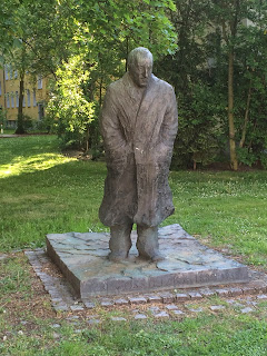 I think the monument is designed to be understated to represent his lonely struggle against war. The hunched posture and grim visage reflects his suffering, emotionally and physically. It's interesting to note that in 1992 there was a court appeal for Von Ossietzky's conviction of espionage and the ruling was upheld according to 1931 law.